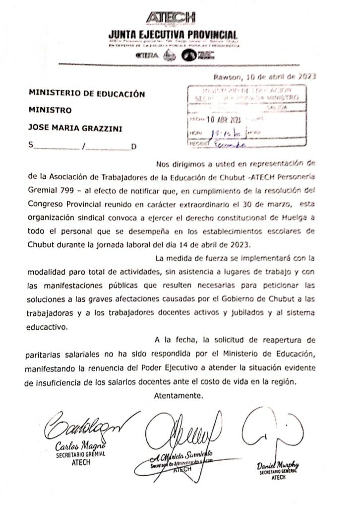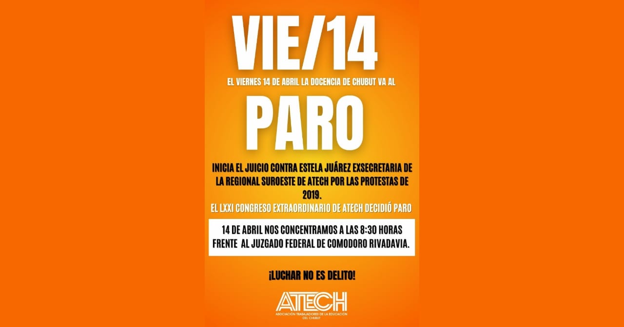 ATECH convoca a una jornada de lucha este viernes 14 de abril. La concentración será en el Juzgado Federal de Comodoro Rivadavia a las 8.30 horas.