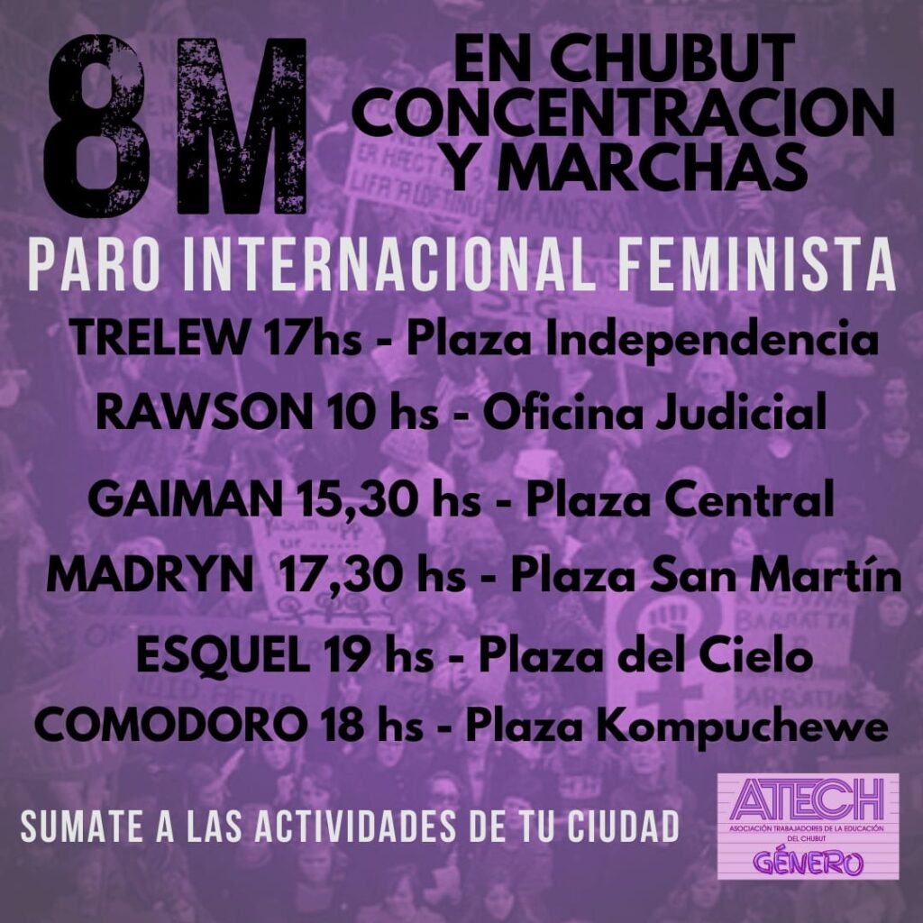 En el marco de Paro Internacional de mujeres, lesbianas, travestis, trans, bisexuales y no binaries, en la diferentes localidades de la provincia de Chubut se realizarán muchas actividades.