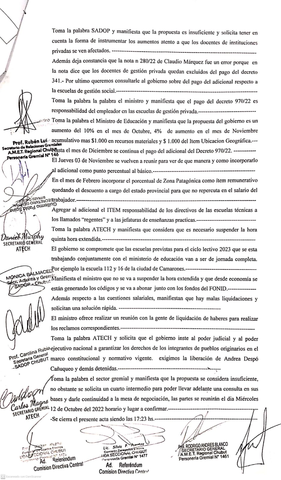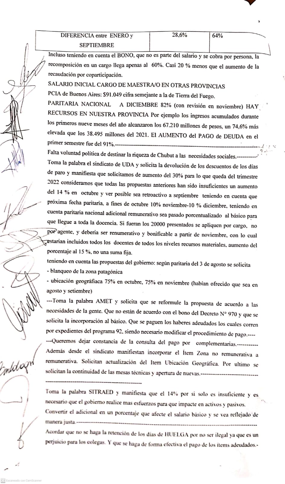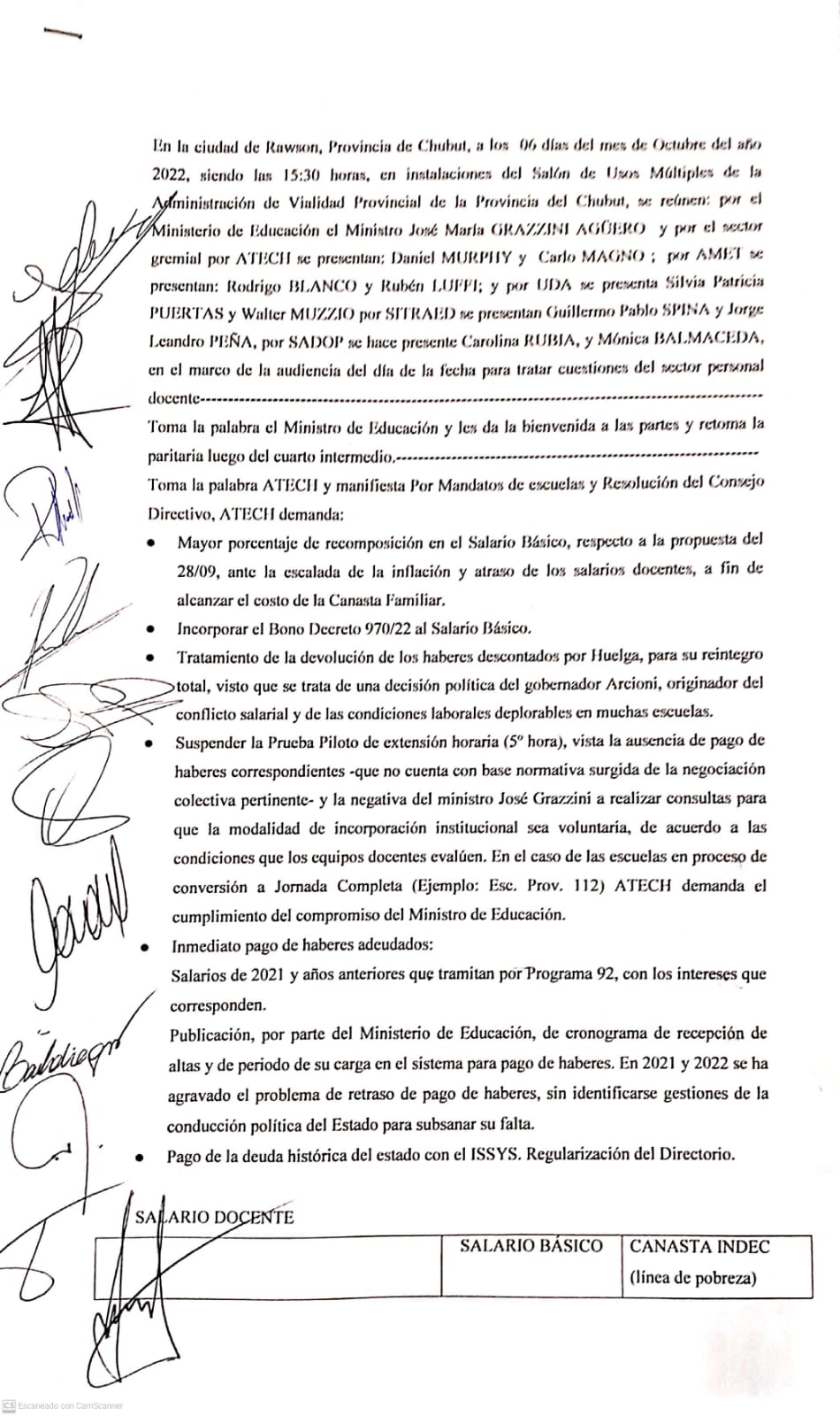 Este jueves 06 de octubre se realizó una nueva reunión paritaria en instalaciones de Vialidad Provincial de la ciudad de Rawson. Se reunieron el sector gremial de ATECH, AMET, UDA, SITRAED y SADOP con el Ministro de Educación José María Grazzini.