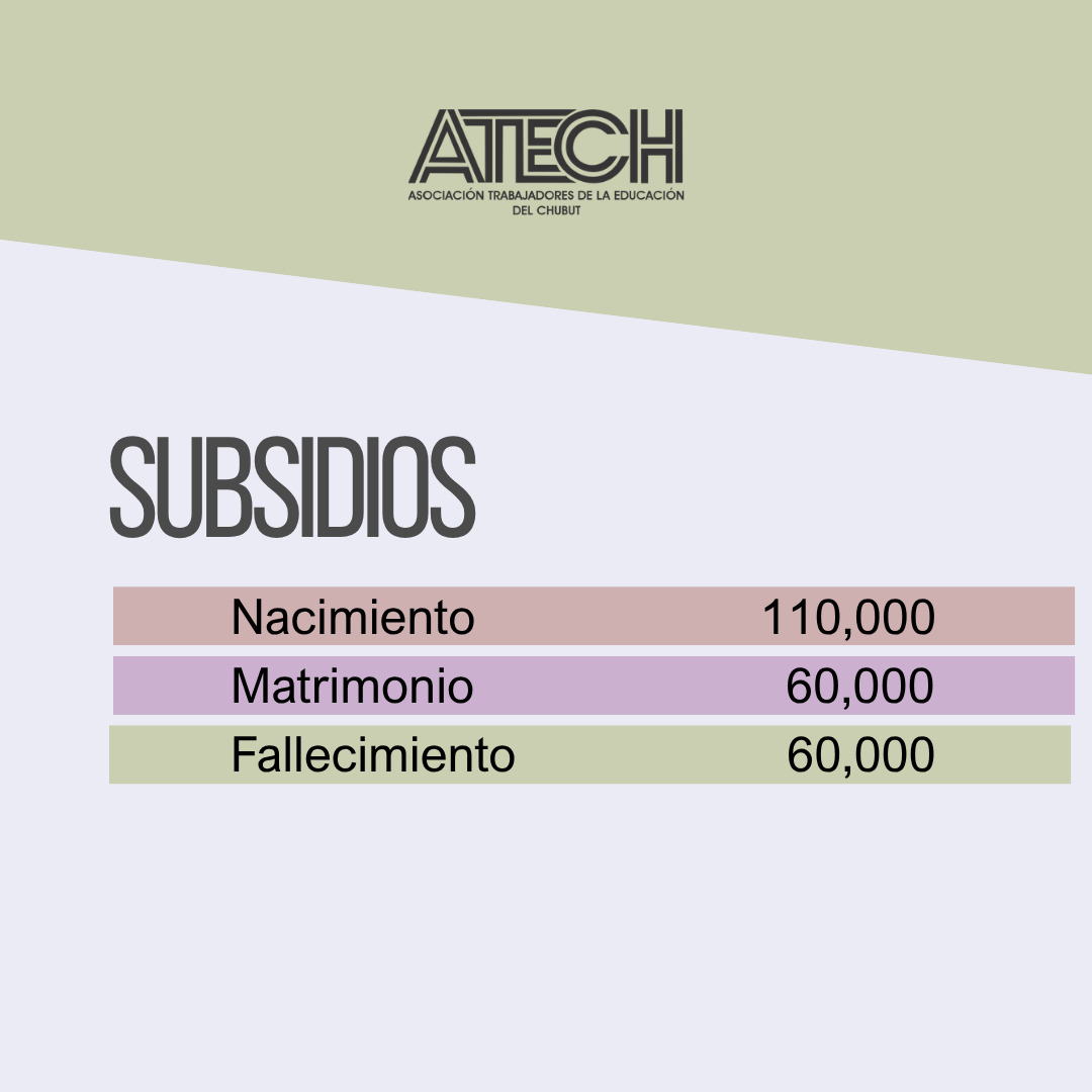 Desde la secretaría de promoción social y turismo de ATECH provincial, les informamos a los afiliados y afiliadas que hemos podido aumentar los subsidios del nacimiento, matrimonio y fallecimiento.