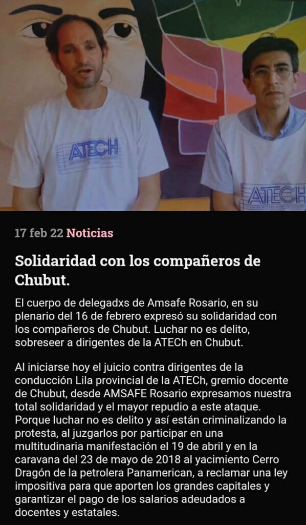 Al iniciarse hoy el juicio contra dirigentes de la conducción Lila provincial de la ATECh, gremio docente de Chubut, desde AMSAFE Rosario expresamos nuestra total solidaridad y el mayor repudio a este ataque. Porque luchar no es delito y así están criminalizando la protesta, al juzgarlos por participar en una multitudinaria manifestación el 19 de abril y en la caravana del 23 de mayo de 2018 al yacimiento Cerro Dragón de la petrolera Panamerican, a reclamar una ley impositiva para que aporten los grandes capitales y garantizar el pago de los salarios adeudados a docentes y estatales.