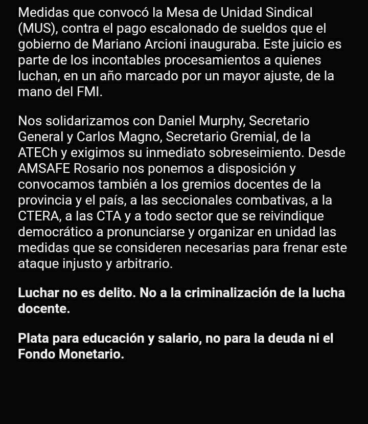 Nos solidarizamos con Daniel Murphy, Secretario General y Carlos Magno, Secretario Gremial, de la ATECh y exigimos su inmediato sobreseimiento. Desde AMSAFE Rosario nos ponemos a disposición y convocamos también a los gremios docentes de la provincia y el país, a las seccionales combativas, a la CTERA, a las CTA y a todo sector que se reivindique democrático a pronunciarse y organizar en unidad las medidas que se consideren necesarias para frenar este ataque injusto y arbitrario.