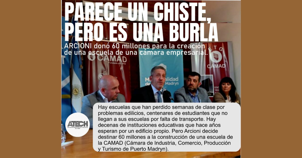 Hay escuelas que han perdido semanas de clase por problemas edilicios, centenares de estudiantes que no llegan a sus escuelas por falta de transporte. Hay decenas de instituciones educativas que hace años esperan por un edificio propio. Pero Arcioni decide destinar 60 millones a la construcción de una escuela de la CAMAD (Cámara de Industria, Comercio, Producción y Turismo de Puerto Madryn).