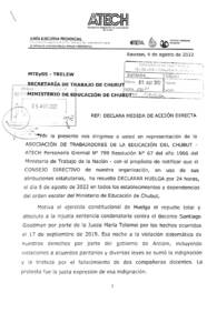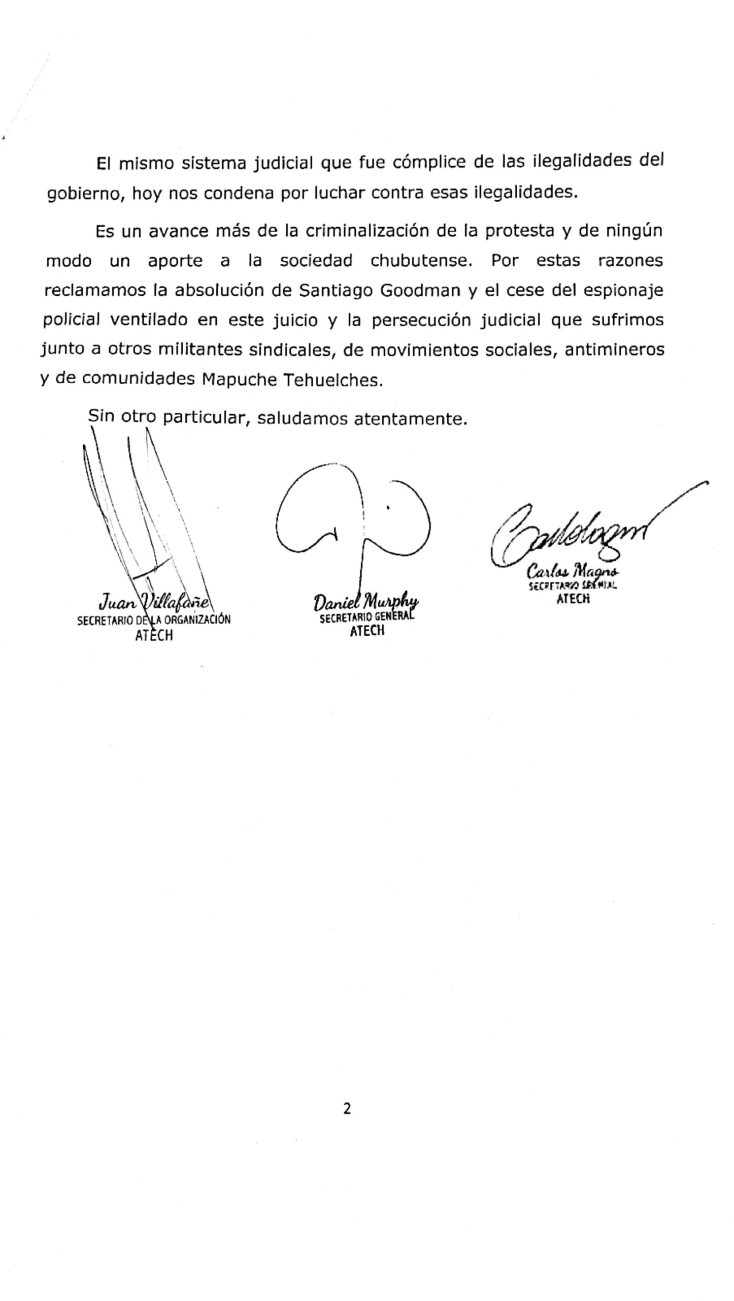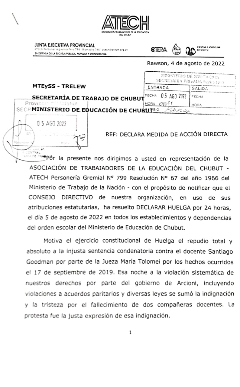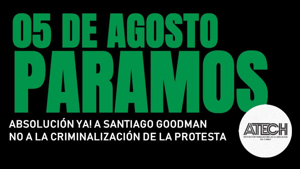 En el día de la fecha el Consejo Directivo de la Atech ha definido la realización de un paro provincial por 24hs para el día de mañana 5/8 con movilización en todas las regionales para repudiar la condena judicial a Santiago Goodman. La justicia de Chubut acaba de condenar como culpable en el Juicio sobre los hechos de Legislatura en septiembre del año 2019 al ex secretario general de nuestro sindicato. Una condena que no es justicia, es criminalización de la protesta.