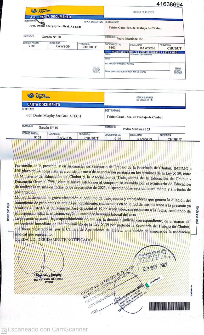 Carta documento enviada a Secretaría de Trabajo en reclamo de la convocatoria a la reunión paritaria postergada.