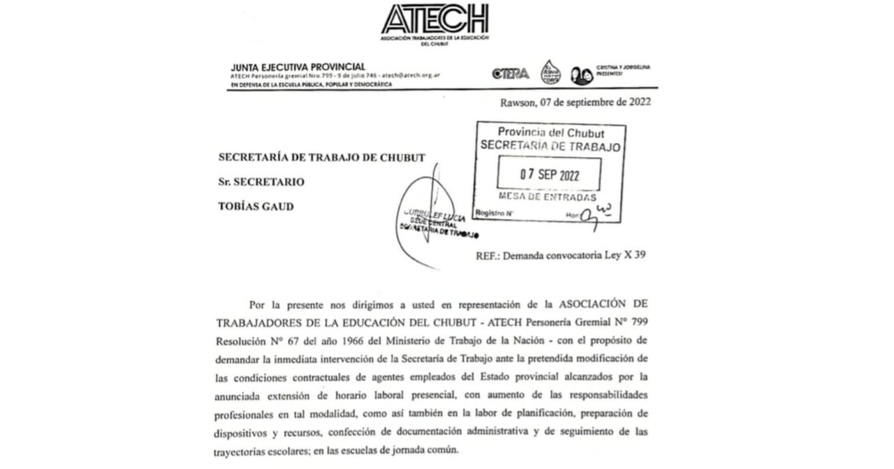 IV) Que se tenga por presentada por ante al Secretaría de Trabajo de Chubut la demanda de la Asociación de Trabajadores de la Educación de Chubut de apercibir al Ministerio de Educación de Chubut con requerimiento de NO INNOVAR en las condiciones de labor de agentes alcanzados por la pretendida implementación de extensión horaria en Escuelas de Nivel Primario, hasta la correspondiente negociación colectiva en el marco de la LEY X 39, para las correspondientes modificaciones salariales y demás previsiones de condiciones laborales.