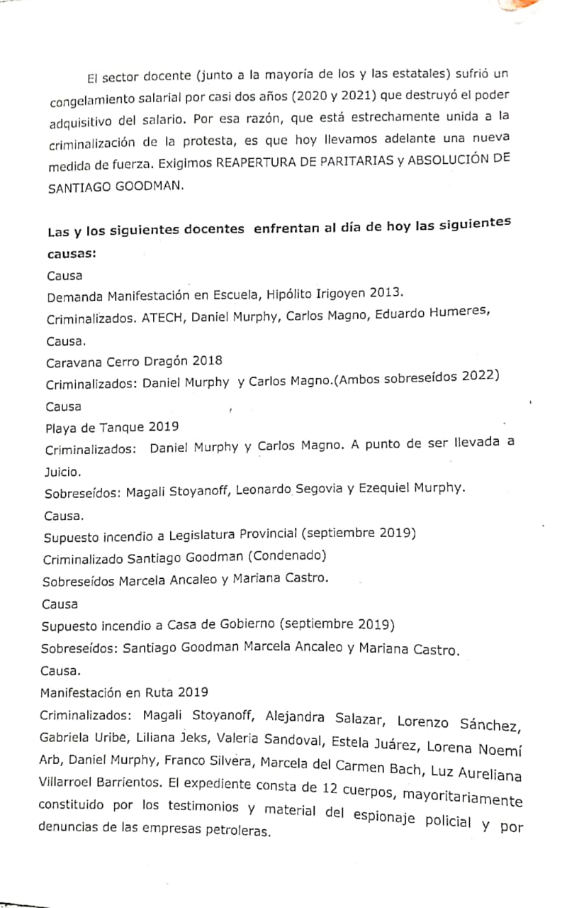 En la segunda hoja está el listado de causas judiciales activas, con la novedad de notificación de inicio de juicio a Estela Juarez, ex secretaria de la Regional Suroeste de ATECH por manifestaciones en la ruta en 2019.