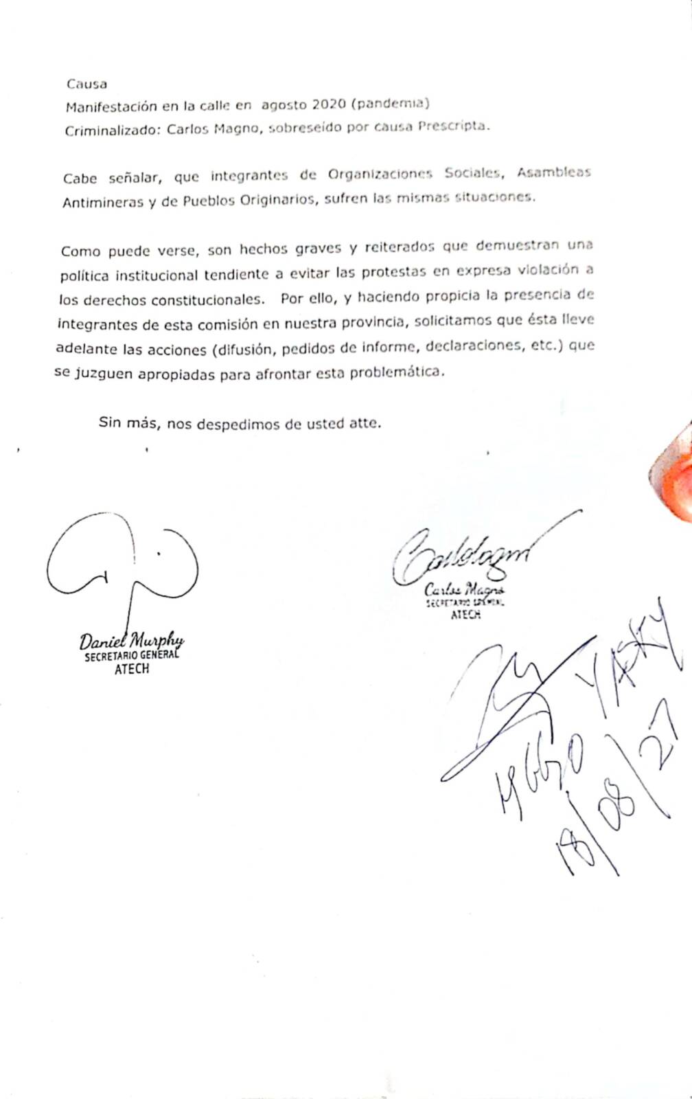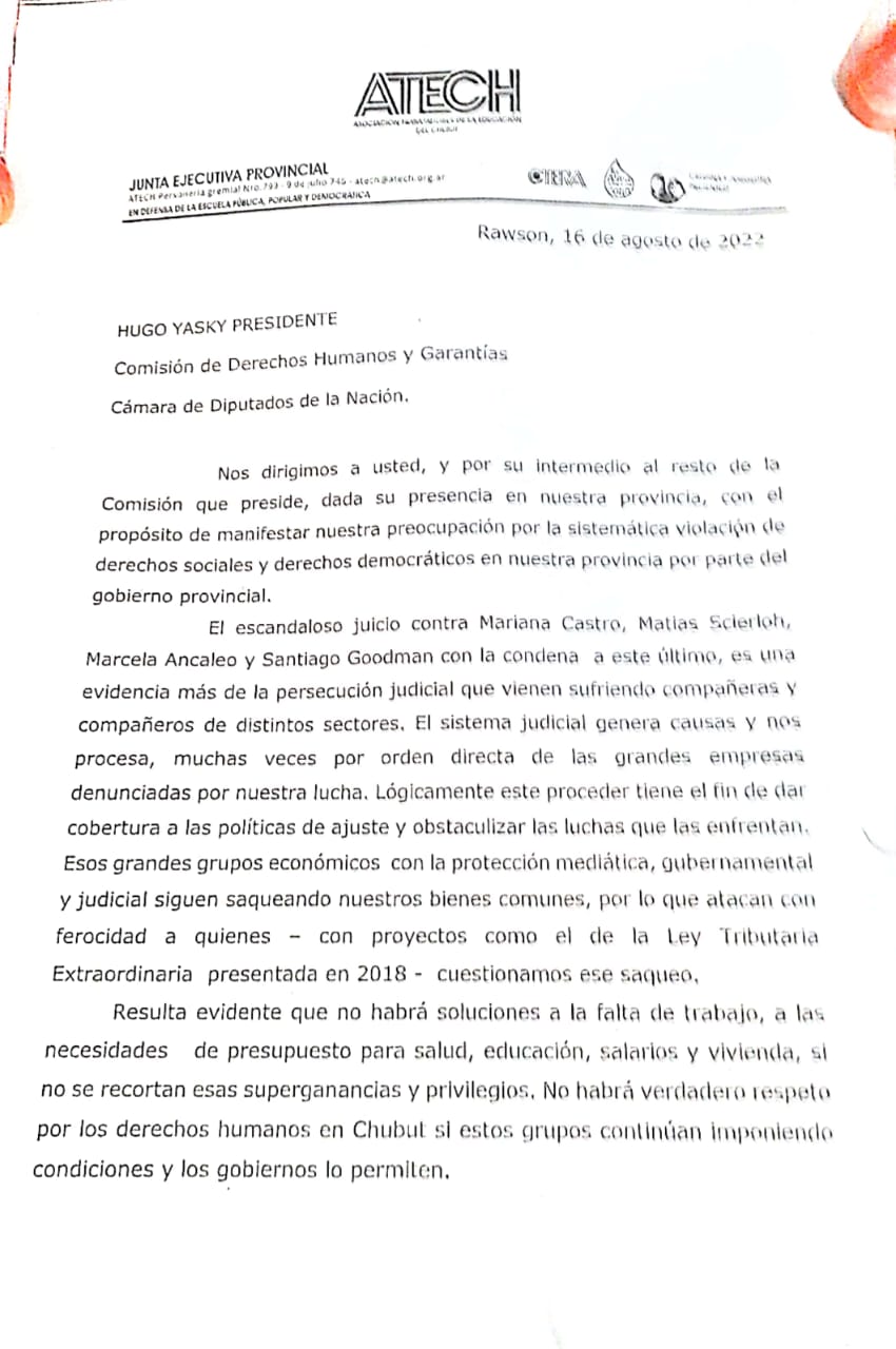 ATECH presentó solicitud a Hugo Yasky, presidente de la Comisión de DDHH del Congreso de la Nación.