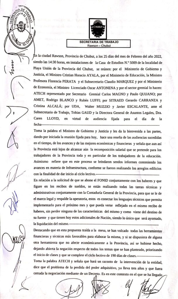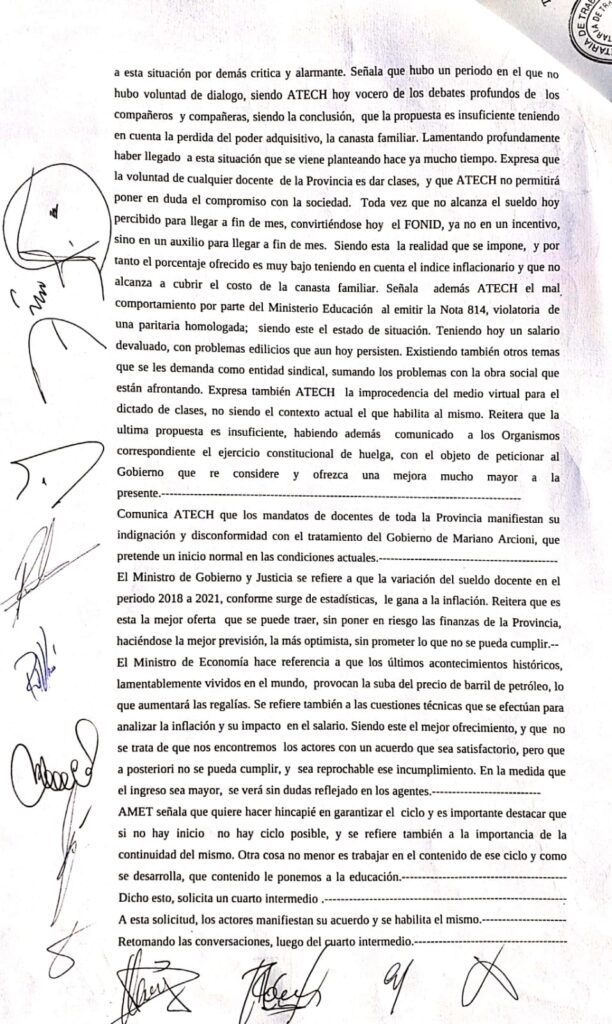 Este viernes 25 de febrero a partir de las 14 horas ATECh participó de una nueva reunión con el Gobierno Pronvicial, tras concluir la misma, desde el sindicato ratificaron el paro de actividades por 72 horas, los días 4,5 y 6 de marzo del 2022.