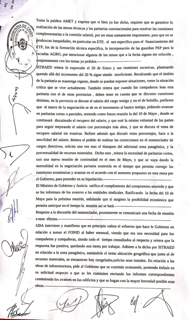 “Llamamos a las y los compañeras y compañeros docentes a ejercer la huelga durante los días 2,3 y 4 de marzo para manifestar nuestra indignación con el tratamiento del gobierno y para exigir que haya una oferta superadora con un salario digno y que alcanza a cubrir la canasta familiar”, concluyó.