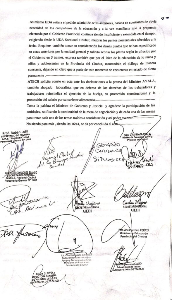 El secretario gremial, Carlos Magno explicó “en la nueva reunión con el Gobierno no hubo ninguna nueva propuesta salarial. Habiendo sido calificada como INSUFICIENTE la última- por centenares de  mandatos- la ATECh ratifica la declaración de paro por 72 horas y ante el llamado a conciliación obligatoria, contesta que la rechazará, ratificando todas las medidas de acción que están programadas”.
