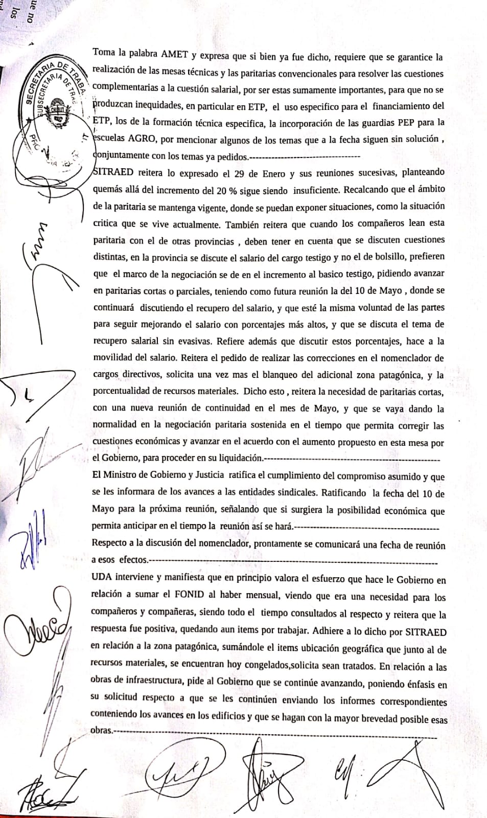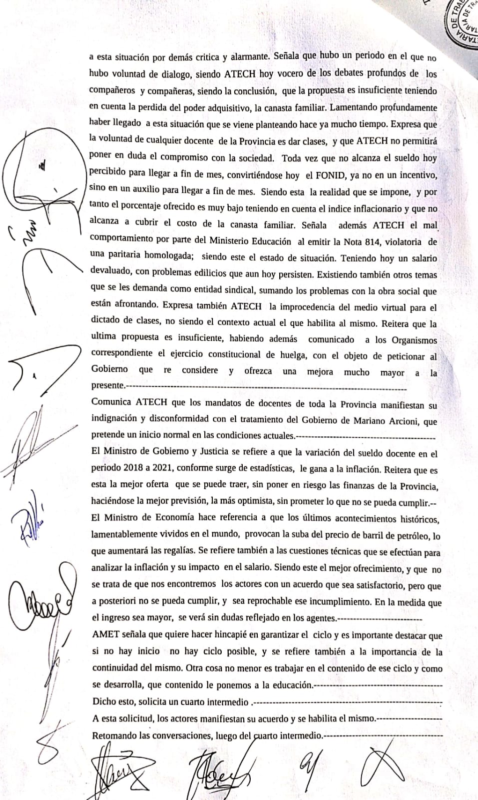 El secretario gremial, Carlos Magno explicó “en la nueva reunión con el Gobierno no hubo ninguna nueva propuesta salarial. Habiendo sido calificada como INSUFICIENTE la última- por centenares de  mandatos- la ATECh ratifica la declaración de paro por 72 horas y ante el llamado a conciliación obligatoria, contesta que la rechazará, ratificando todas las medidas de acción que están programadas”.