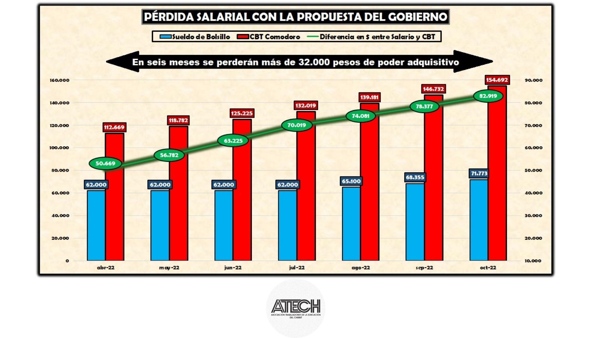 Inclusive con el magro incremento en cuotas propuesto, el trabajador de la educación de Chubut perdería poco más de 32.000 pesos de poder adquisitivo en los próximos seis meses y transformaría en más pobre de lo que es la actualidad.