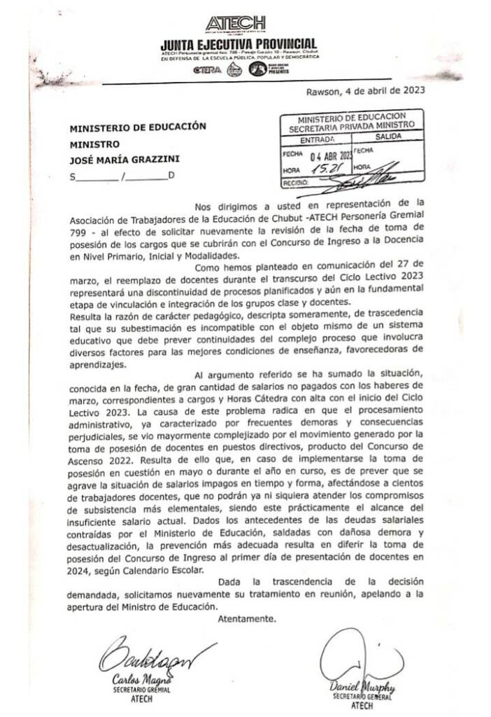 Nota presentada por el CONCURSO DE INGRESO: La toma de posesión debe diferirse al inicio del ciclo lectivo 2024