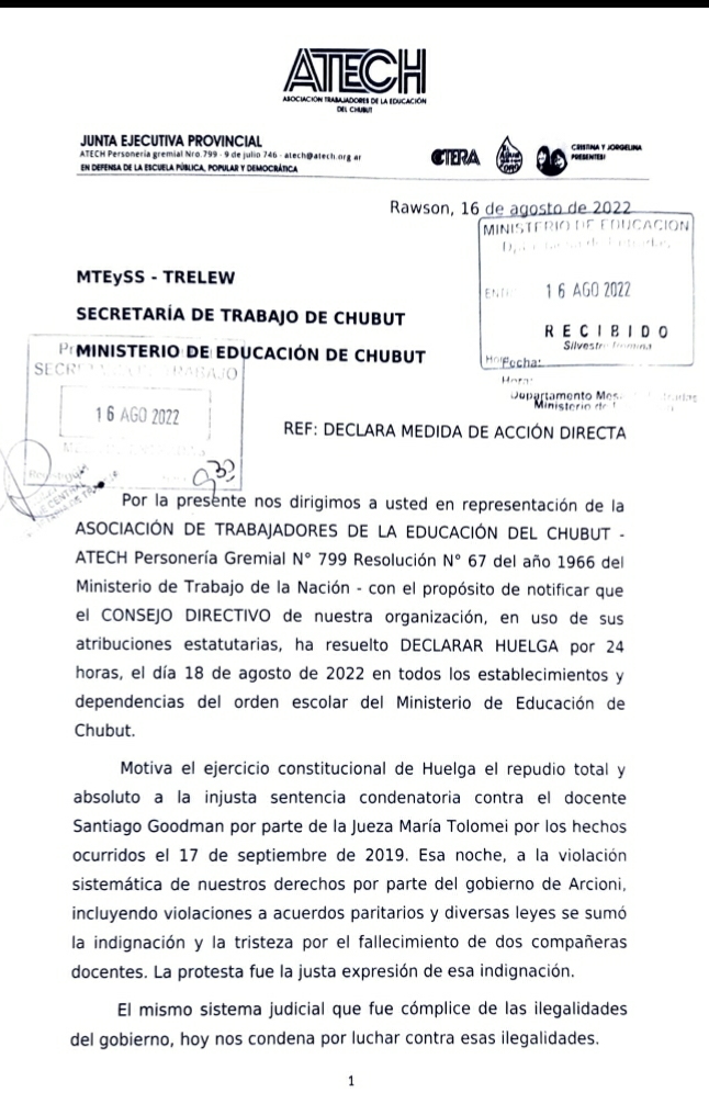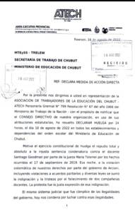 🔴 El CONSEJO DIRECTIVO DE ATECH, en uso de sus atribuciones estatutarias, ha resuelto DECLARAR HUELGA por 24 horas, el día 18 de agosto de 2022 en todos los establecimientos y dependencias del orden escolar del Ministerio de Educación de Chubut.