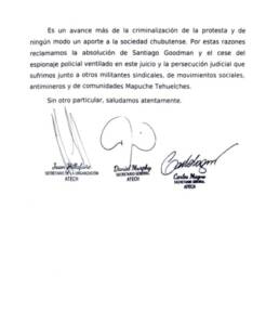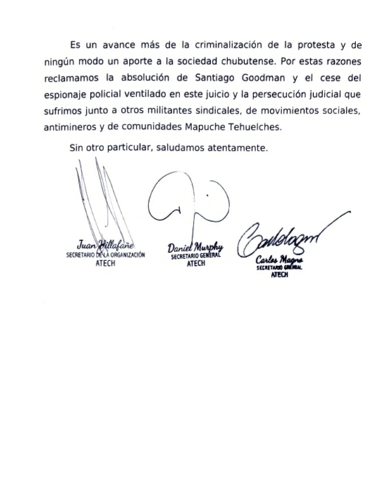 Por estas razones reclamamos la absolución de Santiago Goodman y el cese del espionaje policial ventilado en este juicio y la persecución judicial que sufrimos junto a otros militantes sindicales, de movimientos sociales, antimineros y de comunidades Mapuche Tehuelches.