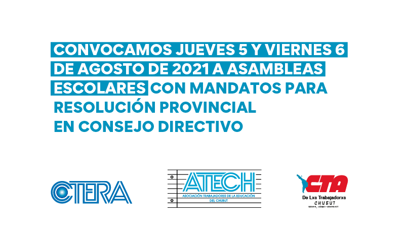 ESTE JUEVES 5 Y VIERNES 6 DE AGOSTO DE 2021 CONVOCAMOS A ASAMBLEAS ESCOLARES CON MANDATOS PARA RESOLUCIÓN PROVINCIAL EN CONSEJO DIRECTIVO.