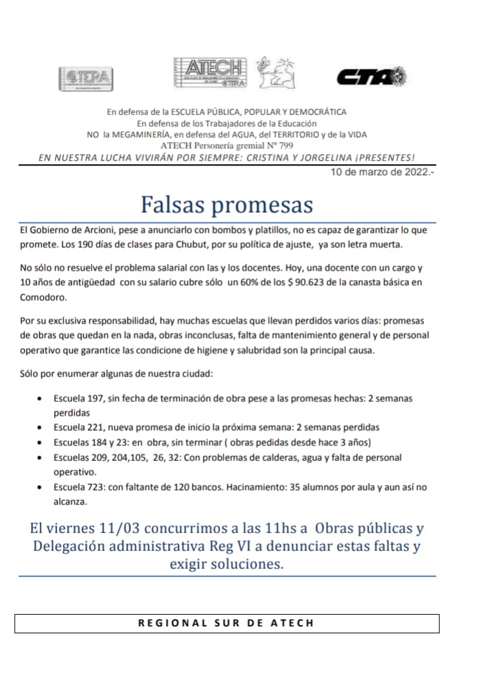 Este viernes 11/03 denunciamos obras inconclusas en escuelas que no iniciaron el ciclo. La convocatoria es en Obras Públicas Km 3 (Comodoro Rivadavia) a partir de las 11 horas.