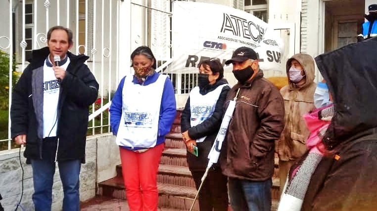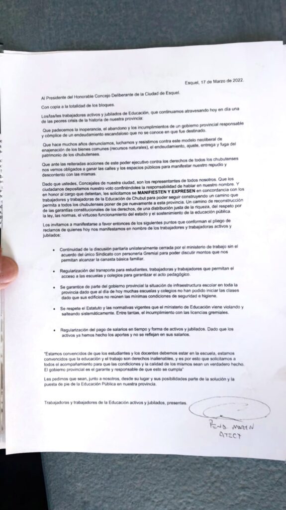 Inició la concentración en Supervisión de Escuelas, luego la Regional Este solicitó a Supervisión de escuelas un respuesta a las demandas y entregó una nota en Municipalidad de Trelew.