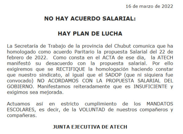Este jueves 17 de marzo del 2022, se concretó un nuevo Paro Docente Provincial de 24 horas. Las localidades de Trelew, Puerto Madryn, Comodoro Rivadavia, Esquel y El Maitén llevaron adelante concentraciones y movilizaciones en reclamo de un salario digno, por paritarias ¡ya! Por infraestructura para las escuelas. Contra los ataques a las organizaciones sindicales. Por una caja de Seguridad Social y una obra social para lxs trabajadorxs.