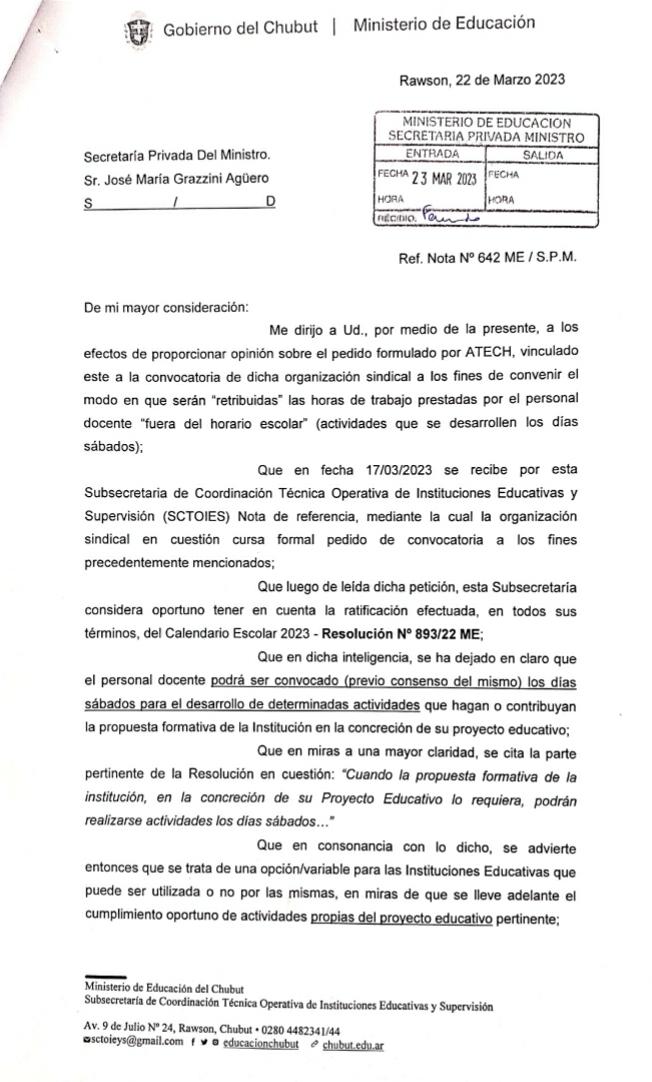 Luego de que el Ministerio de la Educación diera a conocer que en el Calendario escolar 2023 se habilitaba a los equipos directivos a convocar a docentes los días sábados fuera de los horarios de trabajo habitual, ATECH exigió al Ministerio que formule el modo en que serán retribuidas esas horas de trabajo extra como lo establece el sistema legal y vigente de trabajo. (Lee acá la presentación realizada: https://atechlila.duckdns.org/los-sabados-no-trabajamos-gratis/ )
