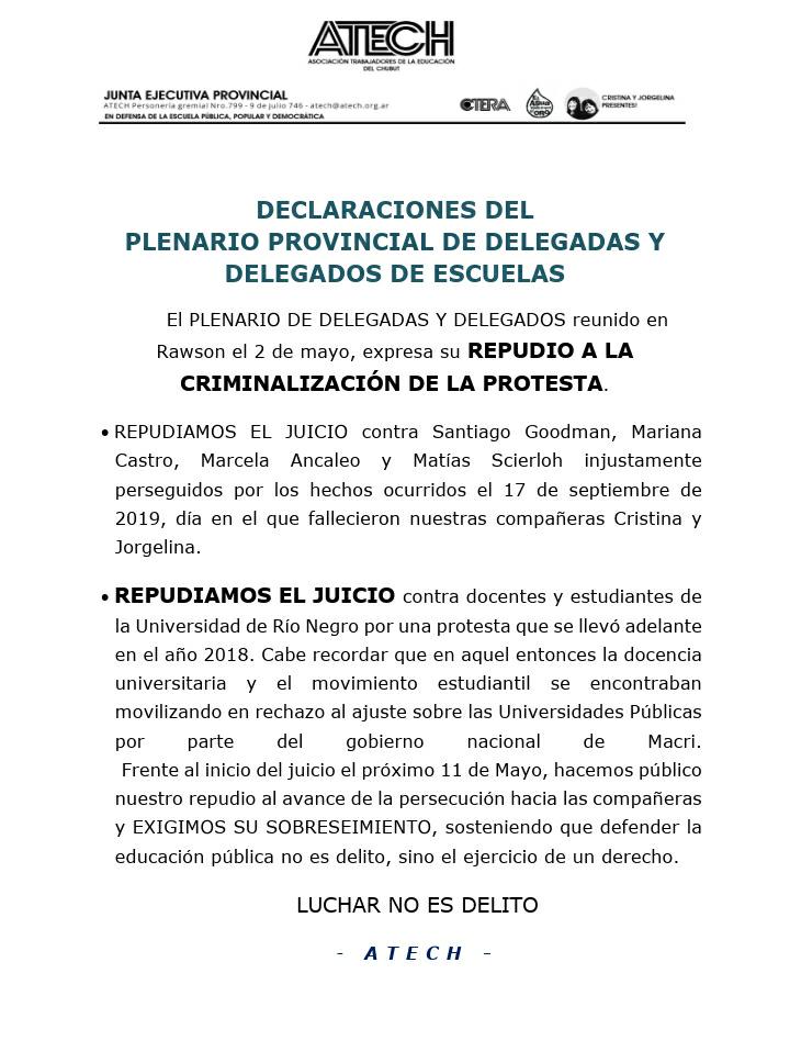 El PLENARIO DE DELEGADAS Y DELEGADOS reunido en Rawson el 2 de mayo, expresa su REPUDIO A LA CRIMINALIZACIÓN DE LA PROTESTA.