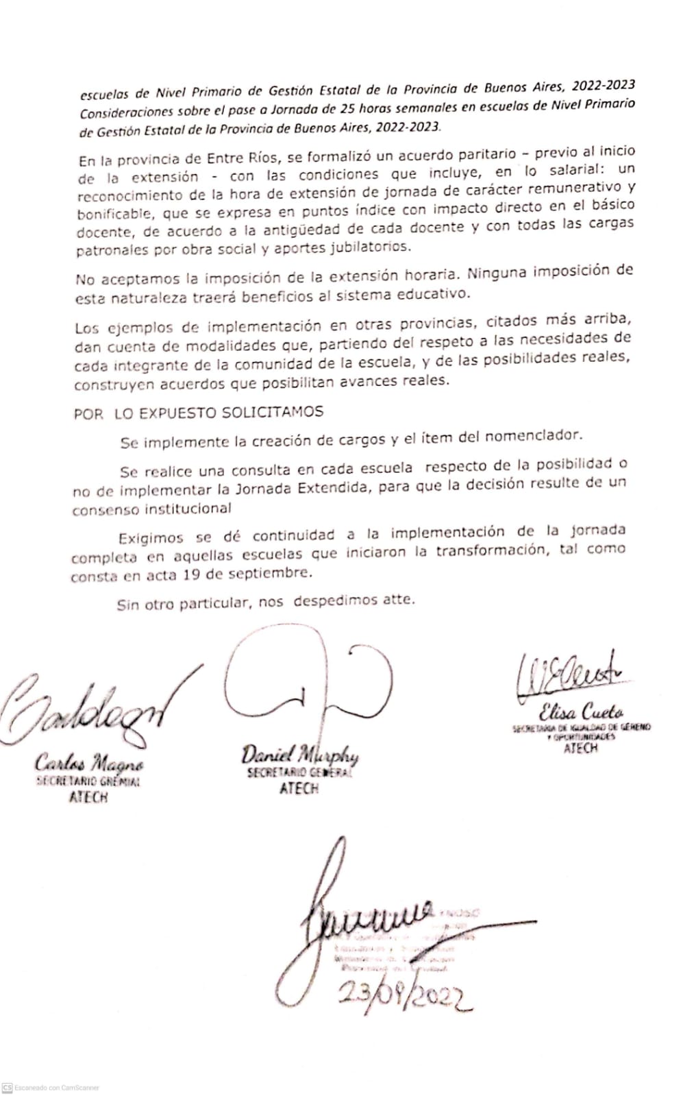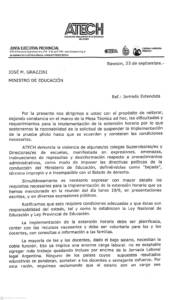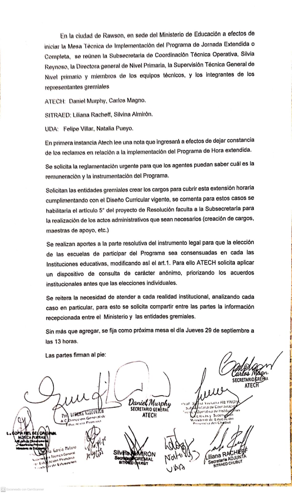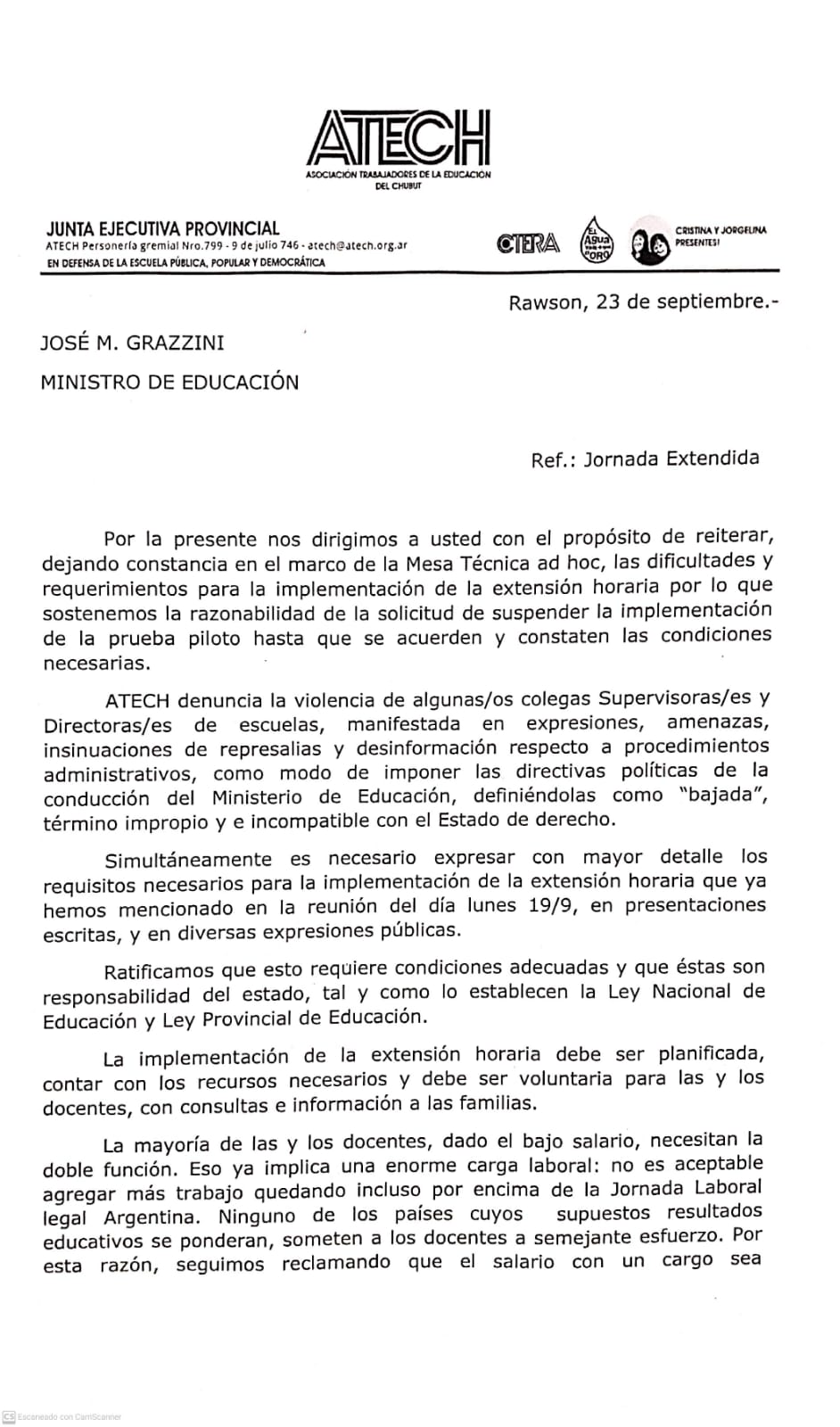 La Junta Ejecutiva Provincial de ATECH se dirigió al Ministro de Educación, José Grazzini con el propósito de reiterar, dejando constancia en el marco de la Mesa Técnica, las dificultades y requerimientos para la implementación de la extensión horaria, sosteniendo la solicitud de suspender la implementación de la prueba piloto hasta que se acuerden y constaten las condiciones necesarias.