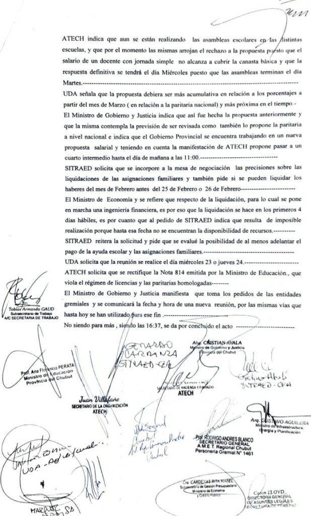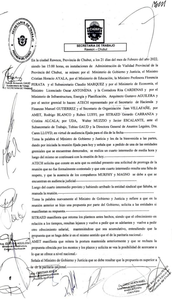 Este lunes 21 de febrero se llevó adelante una nueva reunión entre representantes del gobierno, nuestro sindicato y otros gremios docentes. Damos a conocer el acta de la misma.