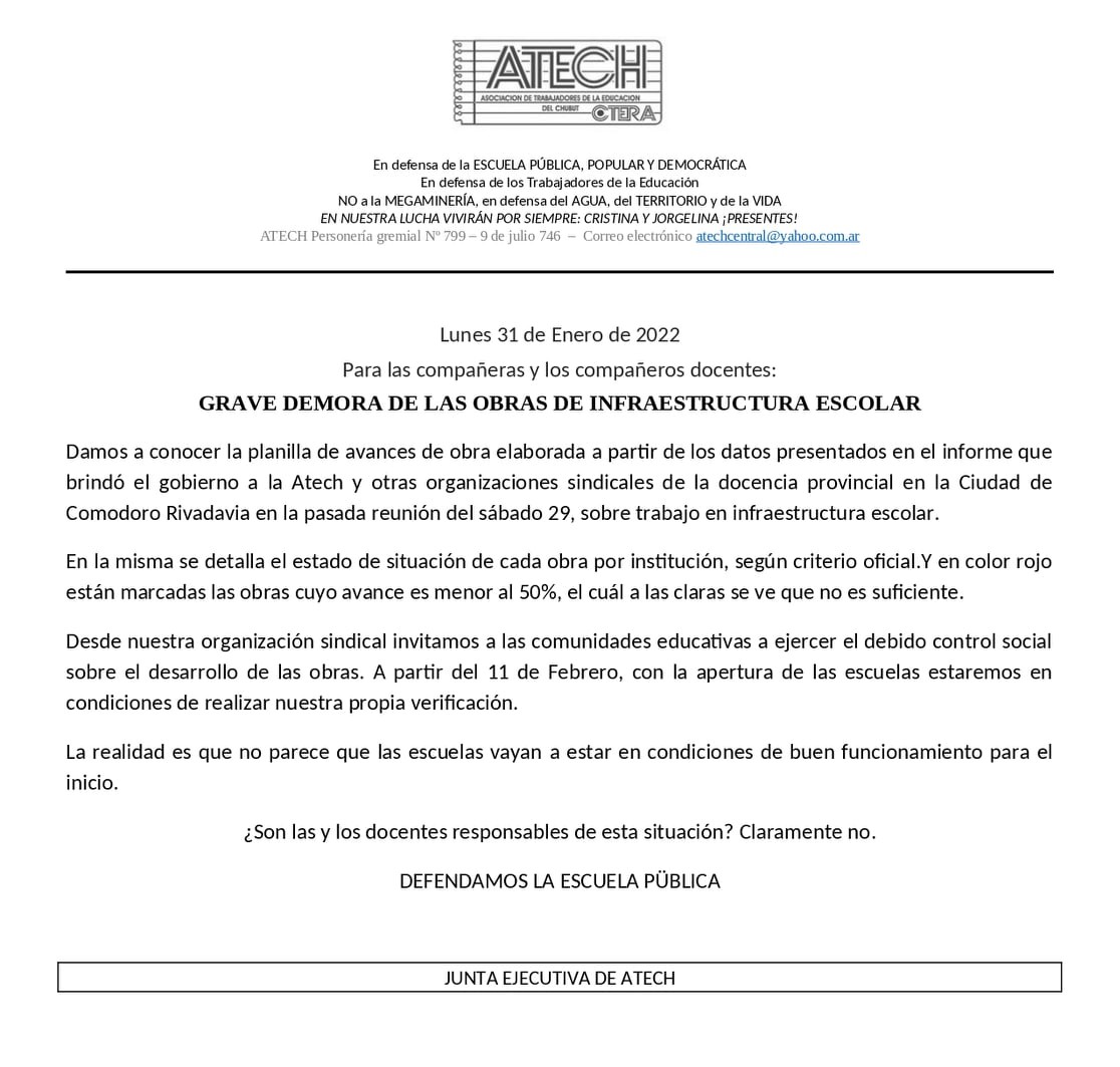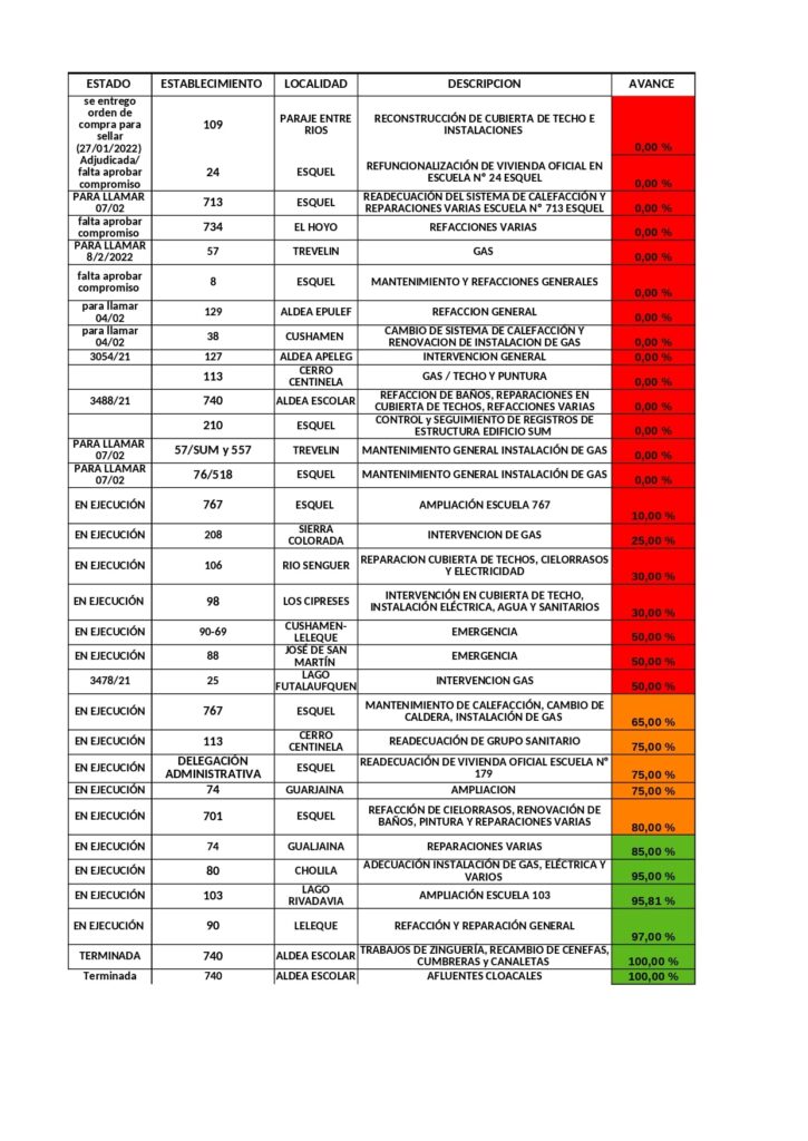 Damos a conocer la planilla de avances de obra elaborado a partir de los datos presentados en el informe que brindó el Gobierno Provincial a la ATECh y otras organizaciones sindicales.