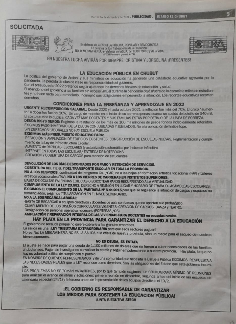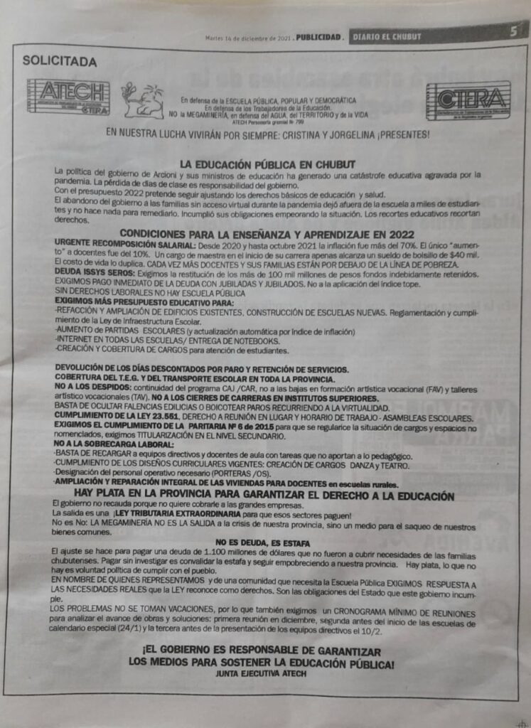 La Junta Ejecutiva de ATECh emitió un comunicado para pedir al Gobierno de Chubut que se garantice el derecho a la educación. Solicitan la recomposición salarial, el pago de la deuda ISSyS Seros, más presupuesto para la educación, devolución de los días descontados por paro y retención de servicios, cobertura del T.E.G y trasporte en toda la provincia, entre otros puntos.