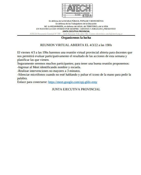 El viernes 4 de marzo del 2022 a las 20 horas, realizaremos una reunión provincial abierta para docentes. Esto nos permitirá evaluar participativamente el resultado de la acción de esta semana y planificar las que vienen.