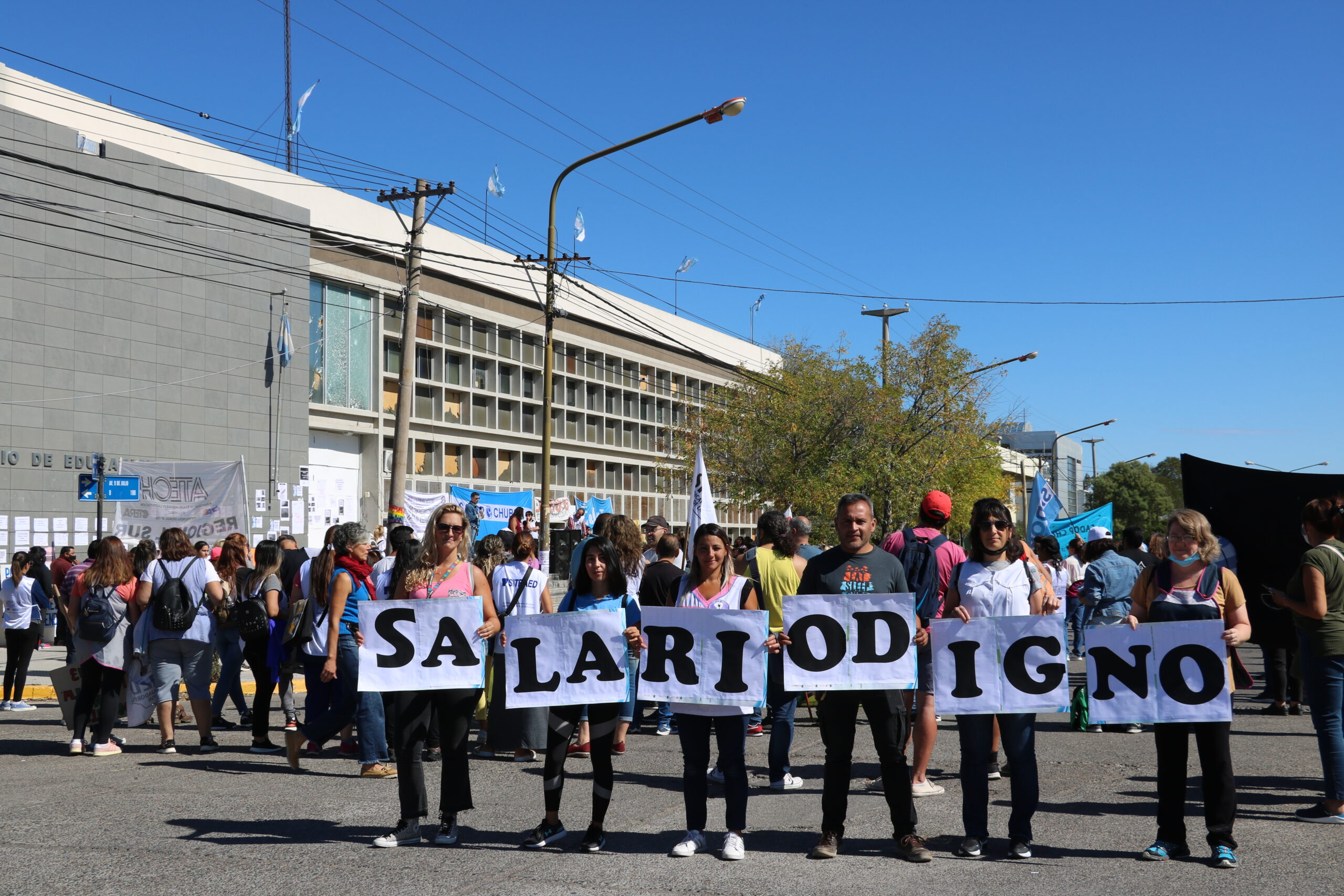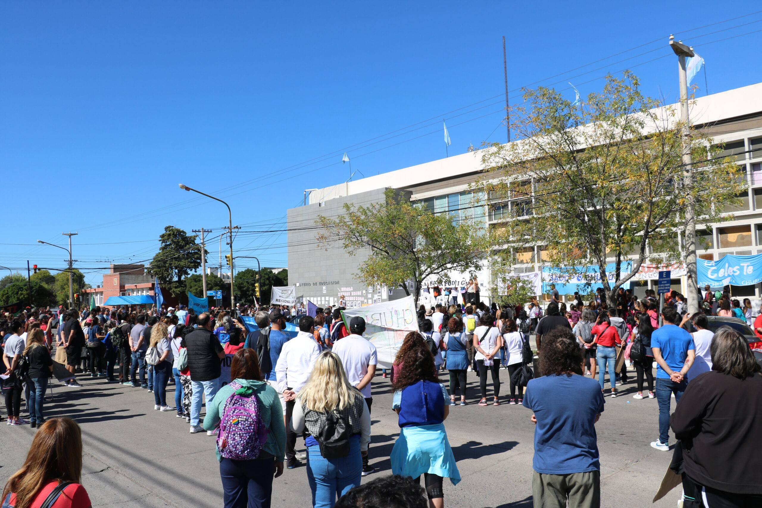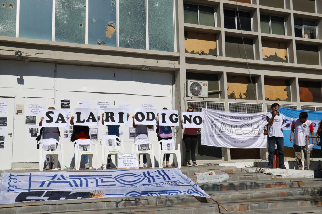 El miércoles 2 de febrero del 2022 se llevó adelante el día 1 de paro. Docentes, no docentes y comunidad en general, se unieron al paro activo y se concentraron en la ciudad de Rawson – y en otros puntos de Chubut – para reclamar por un salario digno y defender la educación pública.