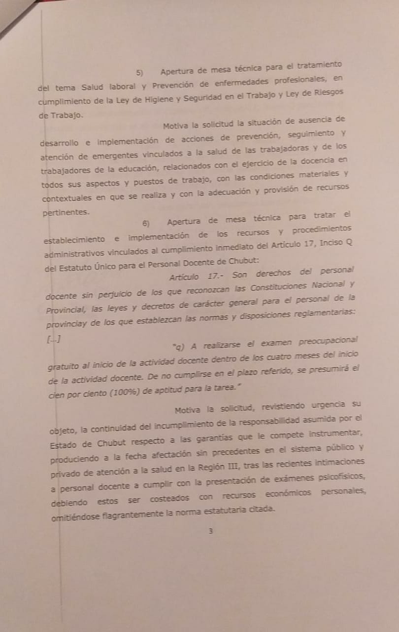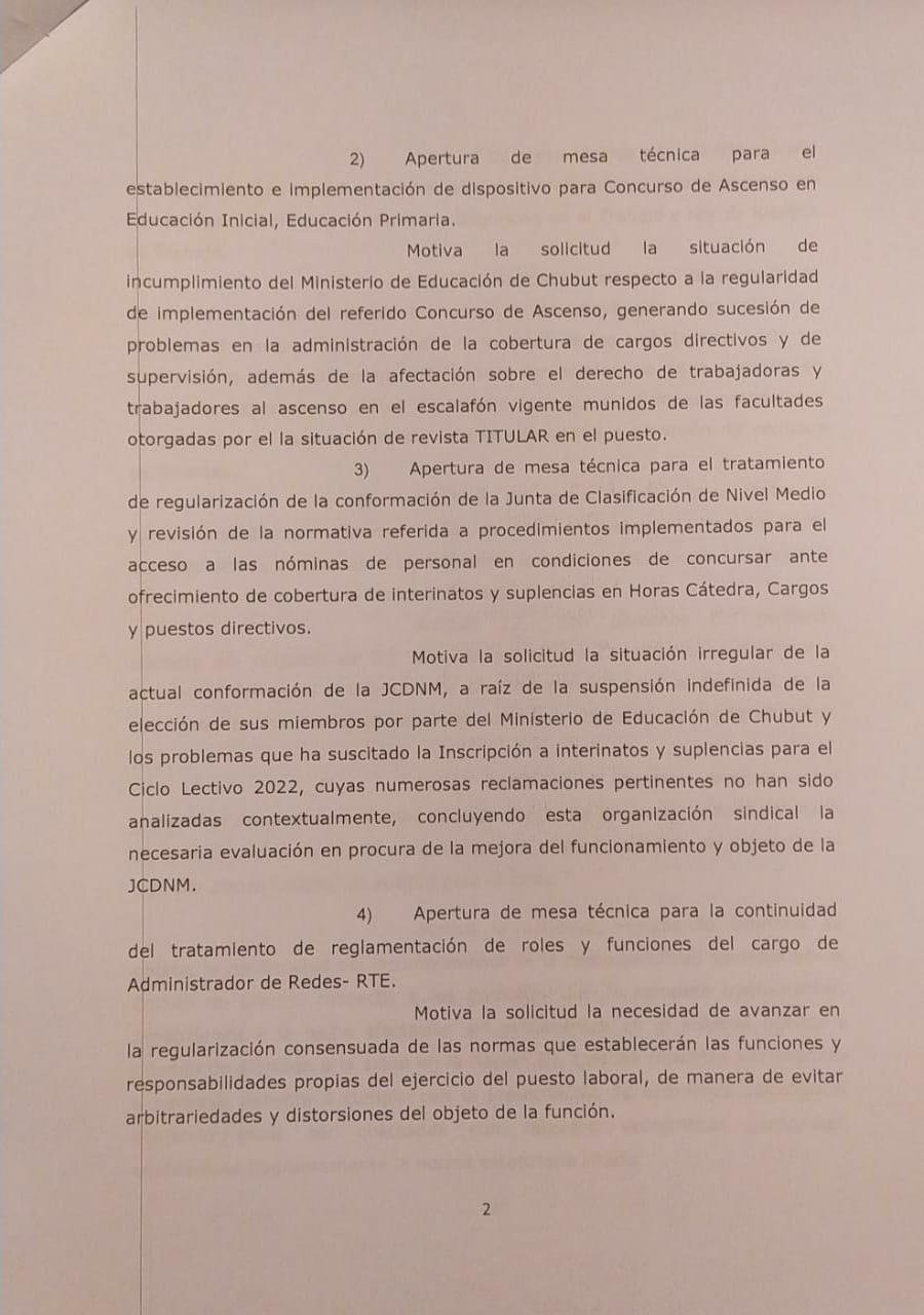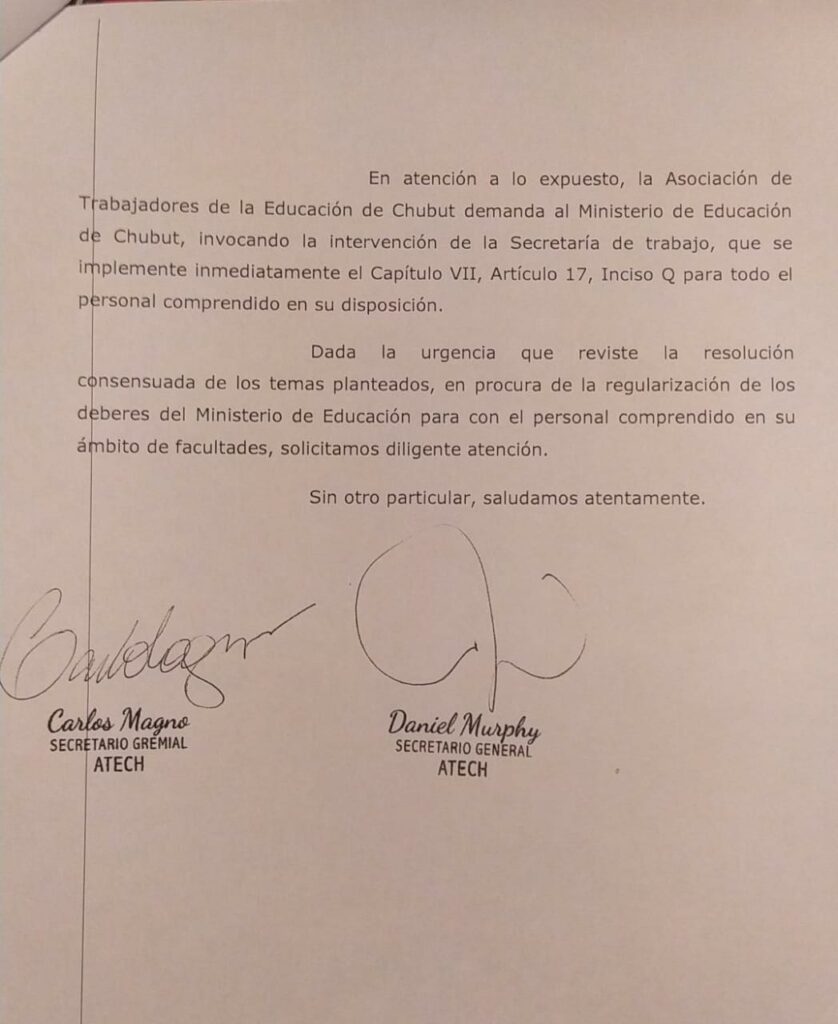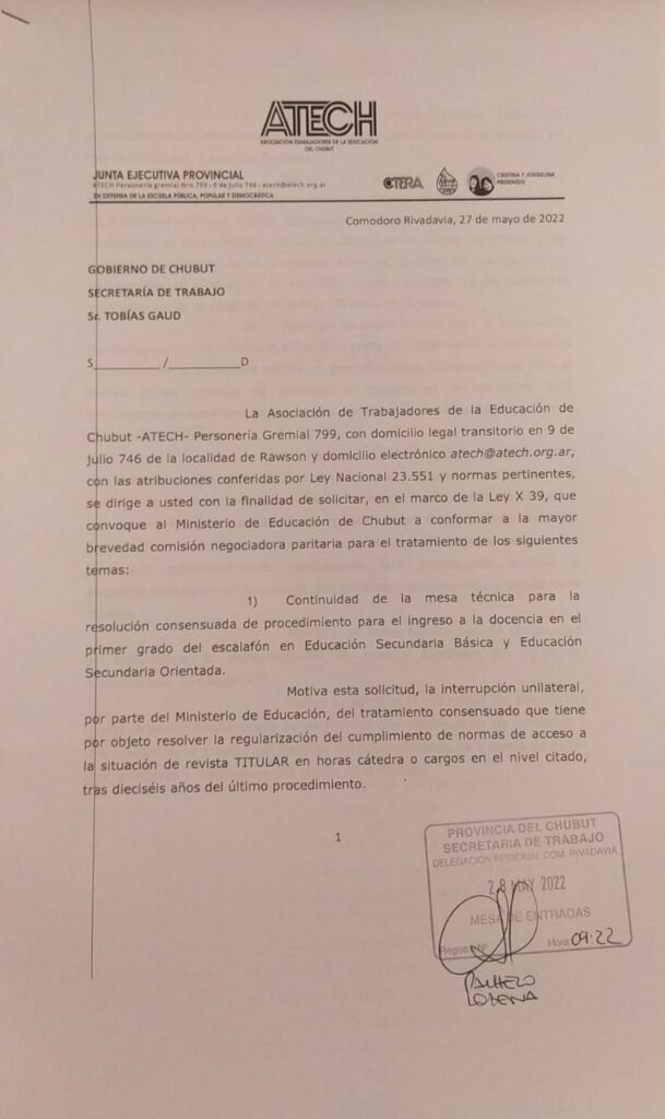 La Asociación de Trabajadores de la Educación de Chubut -ATECH- solicitó al Ministerio de Educación de Chubut a conformar a la mayor brevedad comisión negociadora paritaria para el tratamiento de diversos temas.