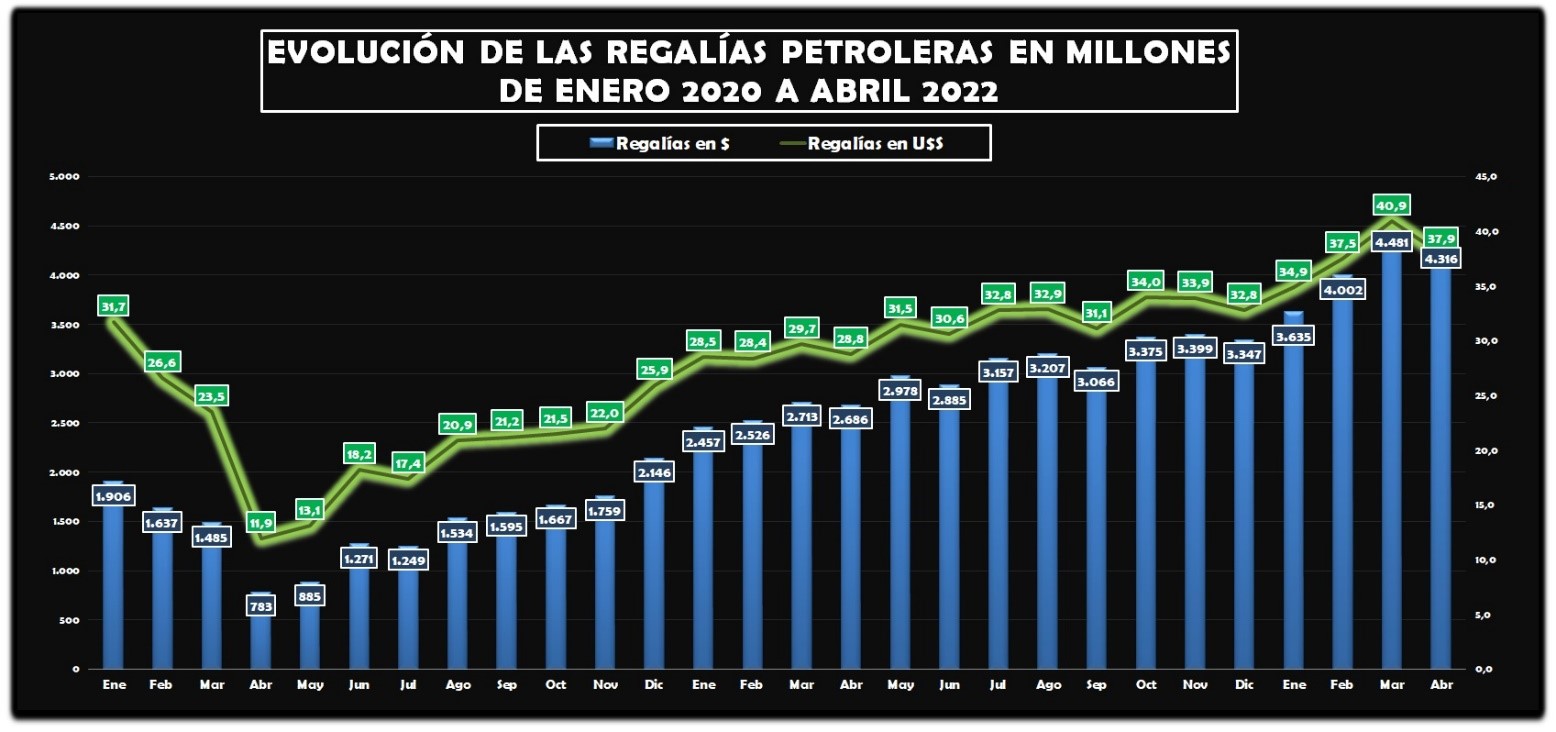 Las regalías petroleras recaudadas en los primeros cuatro meses del 2022 ascendieron a los 151 millones de dólares y traducidas al tipo de cambio oficial fueron de 16.436 millones de pesos.