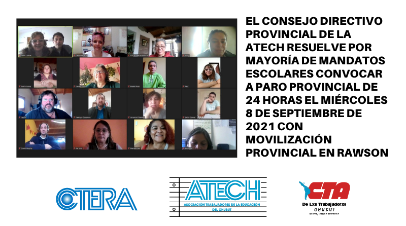 El Consejo Directivo Provincial de la ATECh resuelve por mayoría de Mandatos Escolares, convocar a paro provincial de 24 horas el miércoles 8 de septiembre de 2021, con movilización provincial en la ciudad de Rawson.