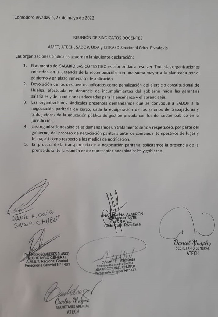 AMET, ATECH, SADOP, UDA y SITRAED Seccional Cdro. Rivadavia.