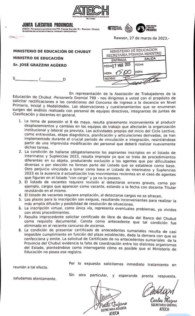 Compartimos presentación realizada al Ministerio de Educación, respecto al Concurso de Ingreso a la docencia en Nivel Primario, Inicial y Modalidades: